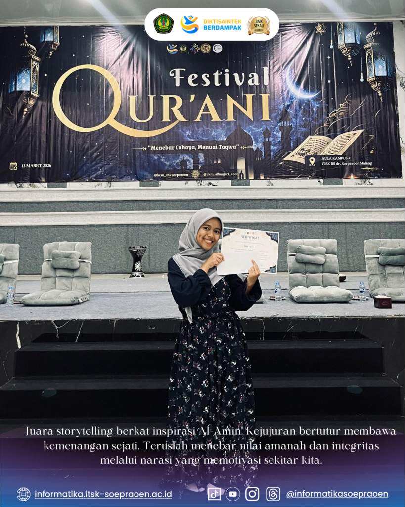 Puncak acara Festival Qur’ani dilaksanakan pada hari ini, Jumat (13/3), bertempat di Aula Kampus 4 ITSK Soepraoen mulai pukul 15.00 WIB. Terdapat tiga cabang lomba islami yang dipertandingkan, yakni Story Telling Kisah Nabi, Musabaqah Hifdzil Qur’an (MHQ), dan Musabaqah Tilawatil Qur’an (MTQ). Suasana aula tampak penuh sesak dengan antusiasme mahasiswa dari seluruh program studi yang hadir untuk memberikan dukungan, serta dihadiri langsung oleh jajaran pimpinan tertinggi mulai dari Rektor, Wakil Rektor, Dekan, hingga perwakilan dosen dari berbagai fakultas.